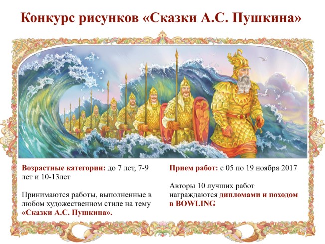 Предметом конкурса являются рисунки на тему «Сказки А.С. Пушкина». Принимаются работы, выполненные любыми художественными способами, приёмами, средствами в цветном или черно-белом исполнении